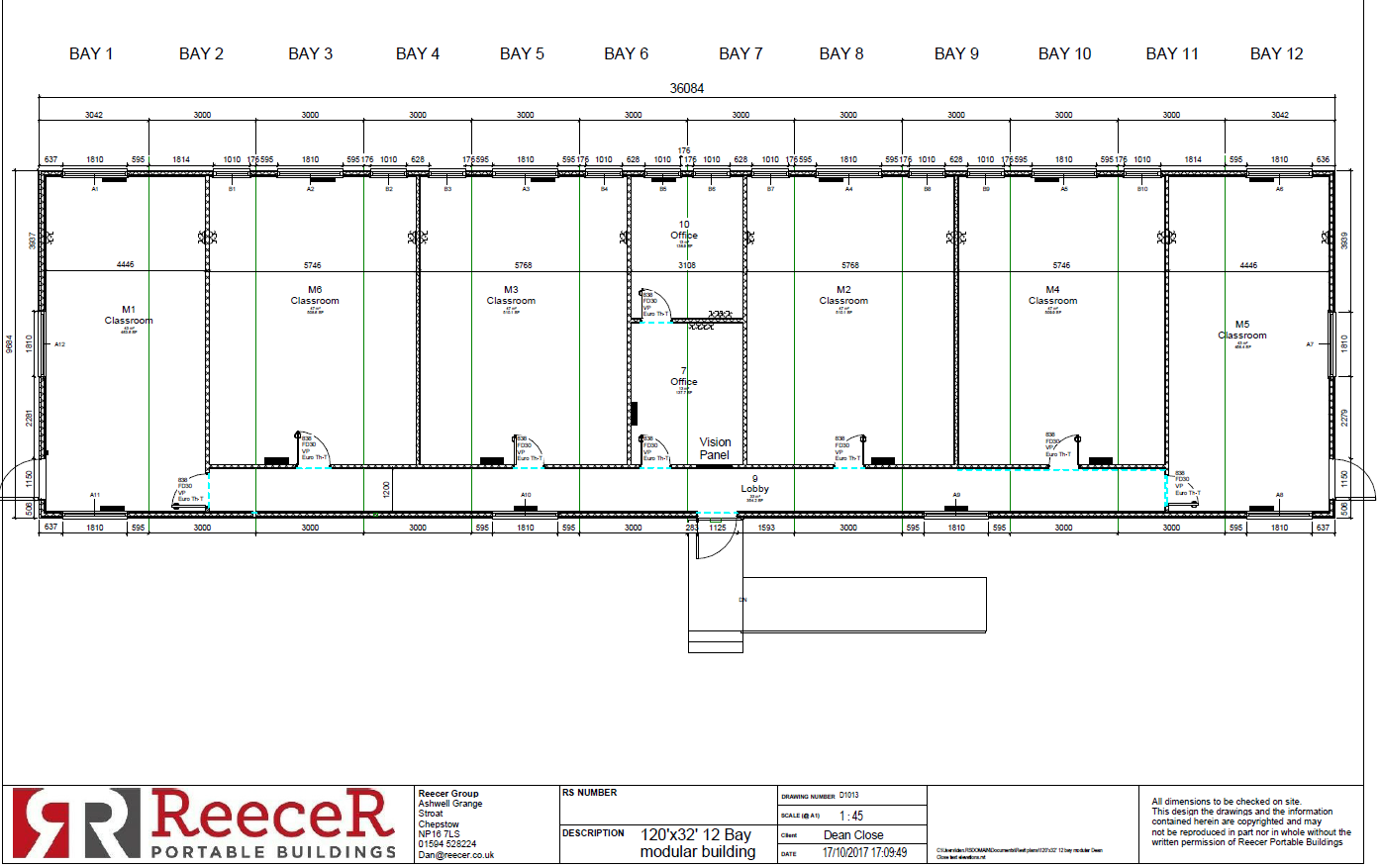 This 12-bay modular building measures 120ft x 32ft overall, with each bay sized at 32ft x 10ft. It is currently configured as a classroom block, split into 7 individual rooms with a central hallway connecting the space. The unit is in very good condition and benefits from multiple windows allowing plenty of natural light, along with a central pedestrian access door and fire exit doors at both ends. The internal layout can also be reconfigured to suit your specific requirements, making it a flexible solution for a wide range of projects.