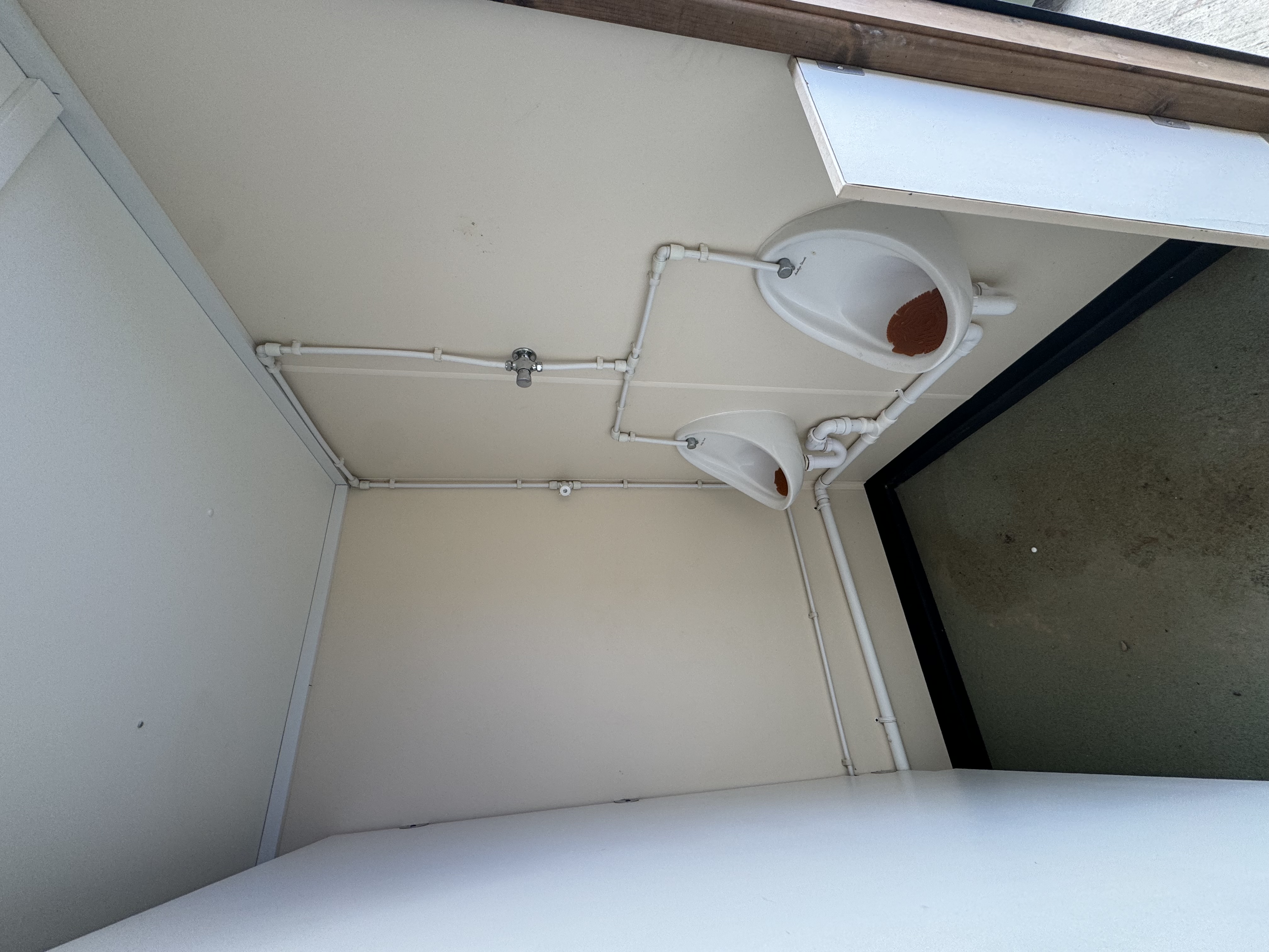 The Unit Is Made Up Of Two Sections. The Larger Section Includes Two Toilets With Cubicles, Two Hand Wash Basins And Two Urinals. The Other Section Is Provided With An Individual Toilet With Hand Wash Basin
