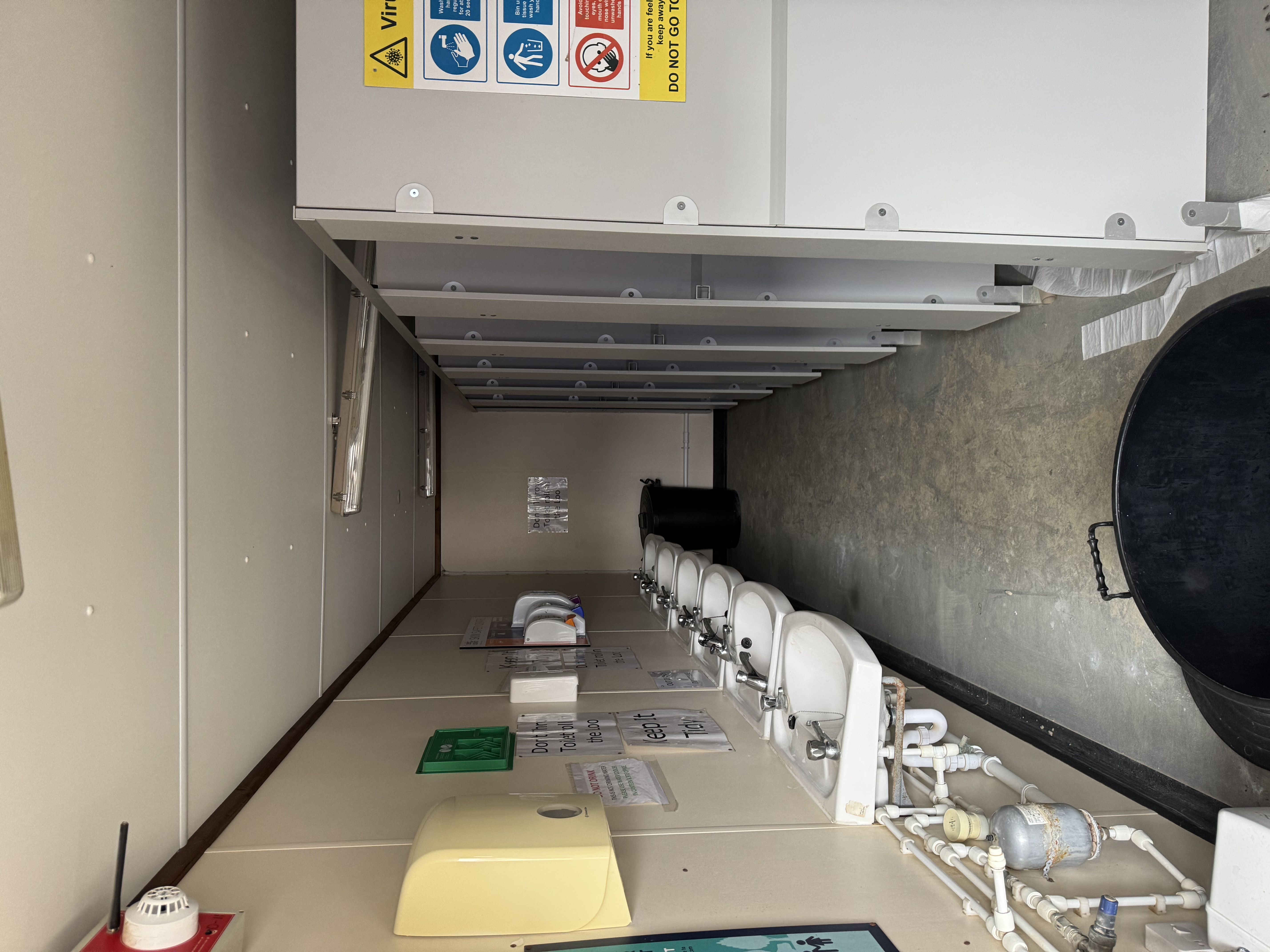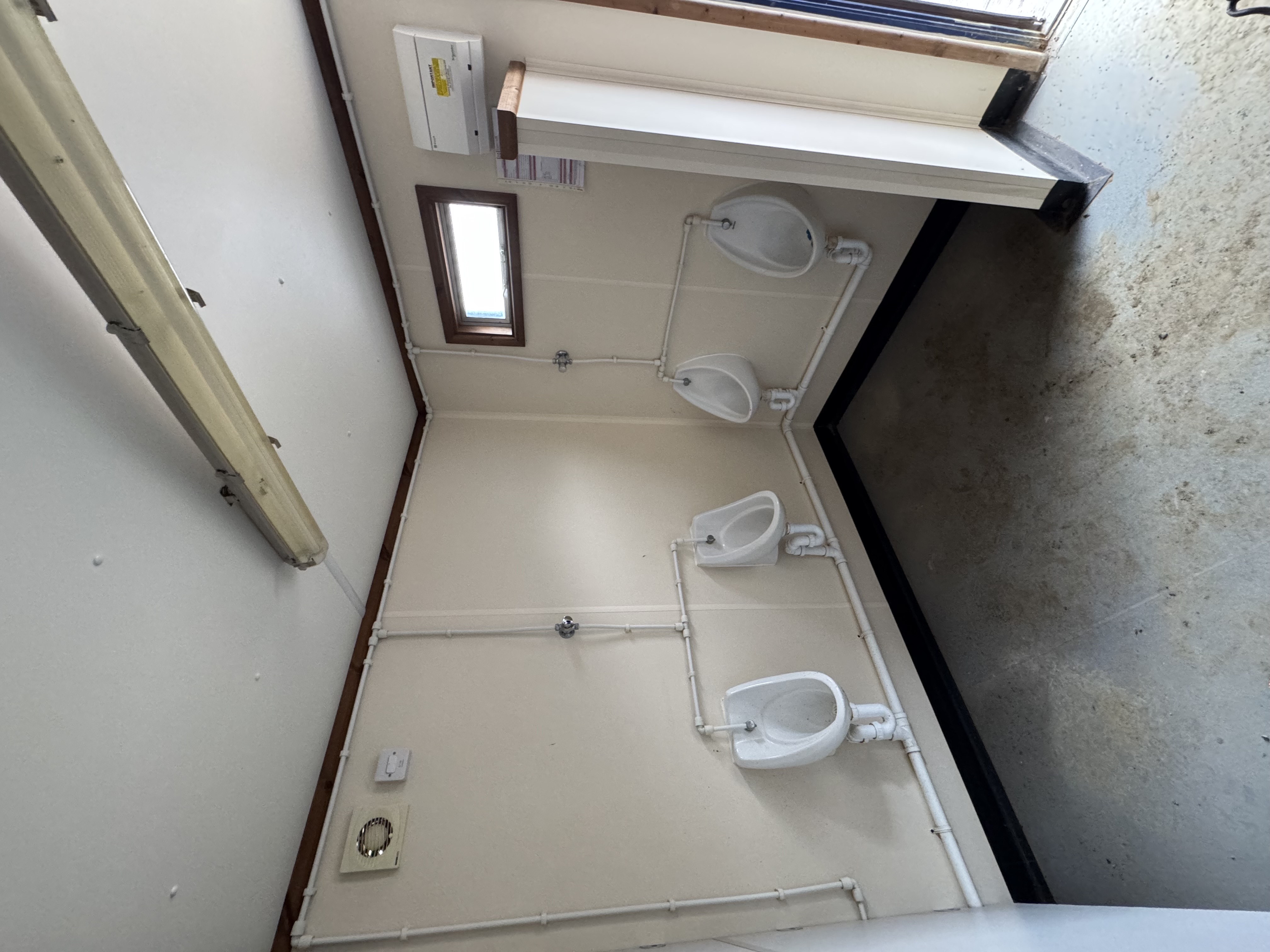 The male section is fully equipped with 6 cubicles, 6 hand basins, 4 urinals, and 1 shower, providing ample facilities for high-traffic site use. The female section is separate and includes a private toilet, hand basin, and shower.