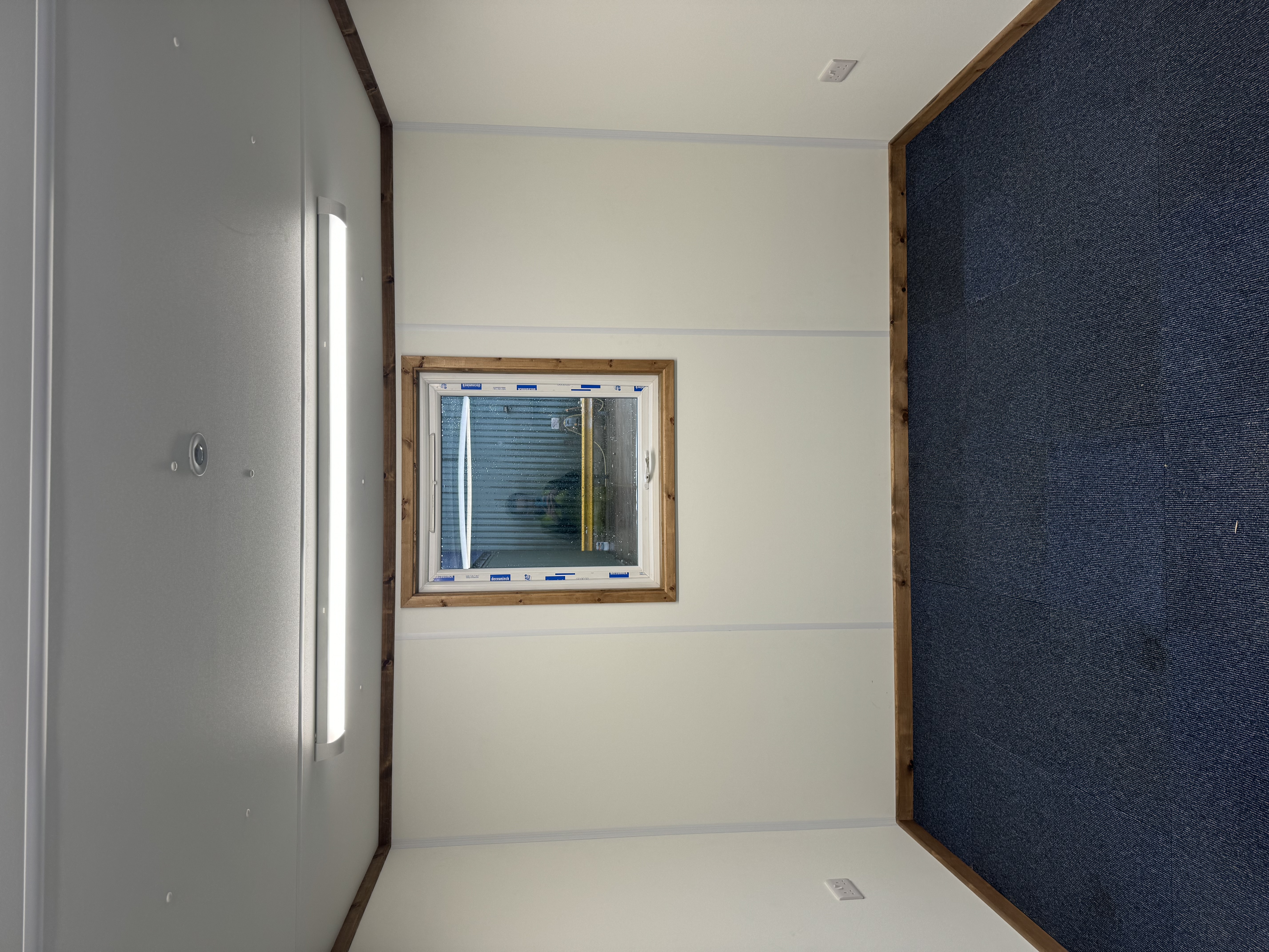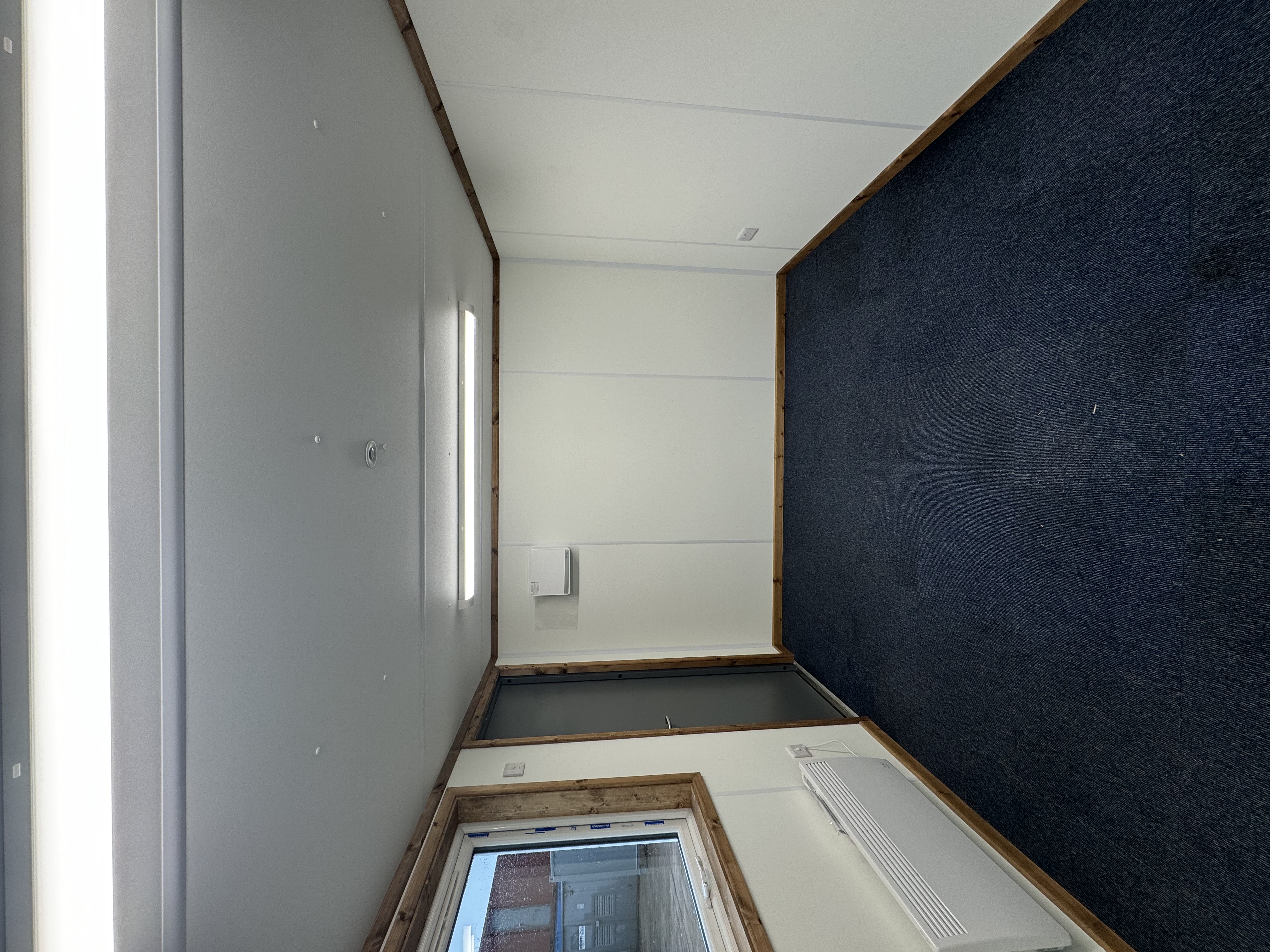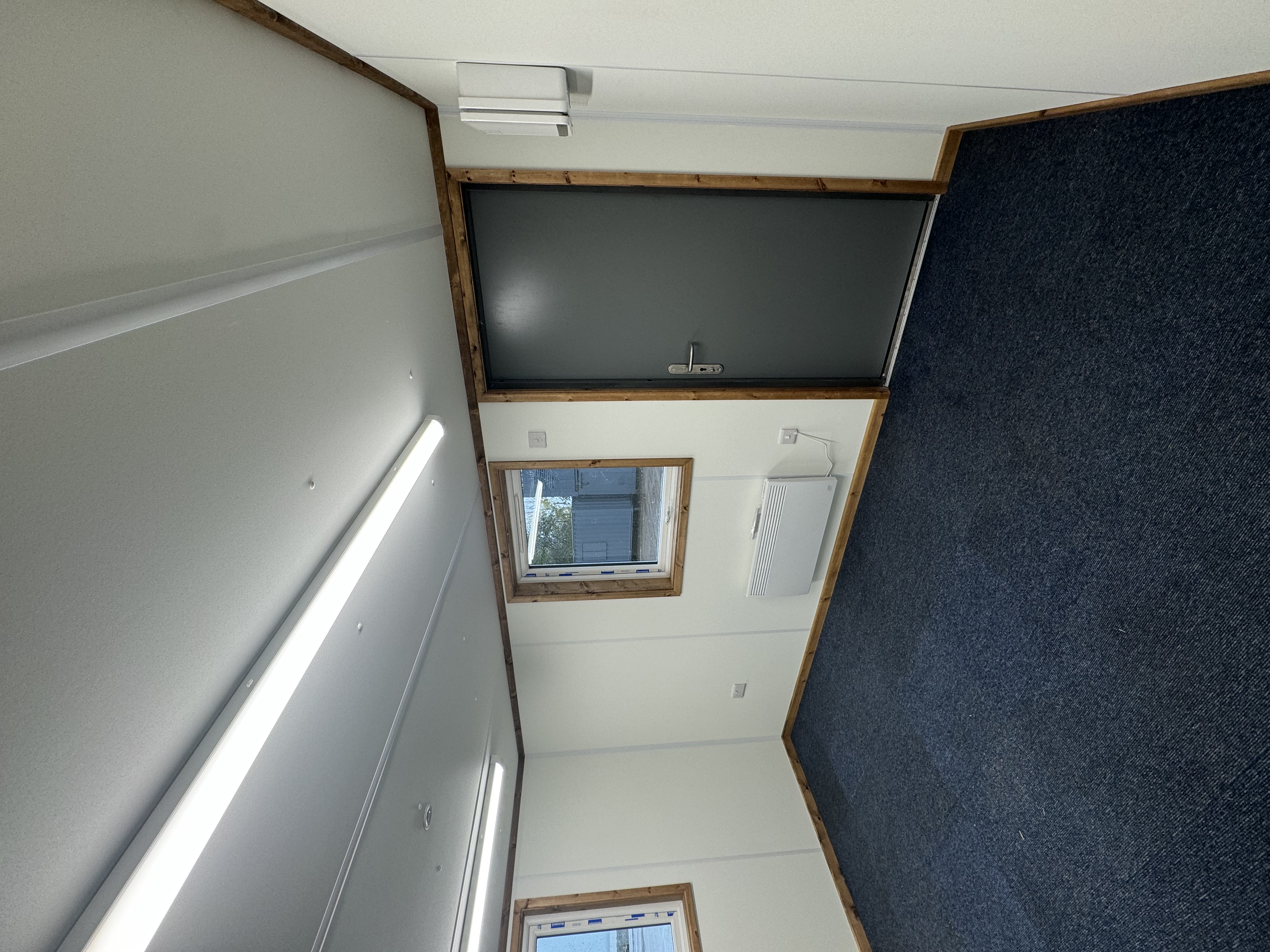 The interior features high-quality carpet tiles, enhancing comfort and giving the space a polished, professional appearance. A secure, user-friendly pedestrian door allows easy access, while standard heating, lighting, and electrical systems ensure the unit is ready for immediate use.